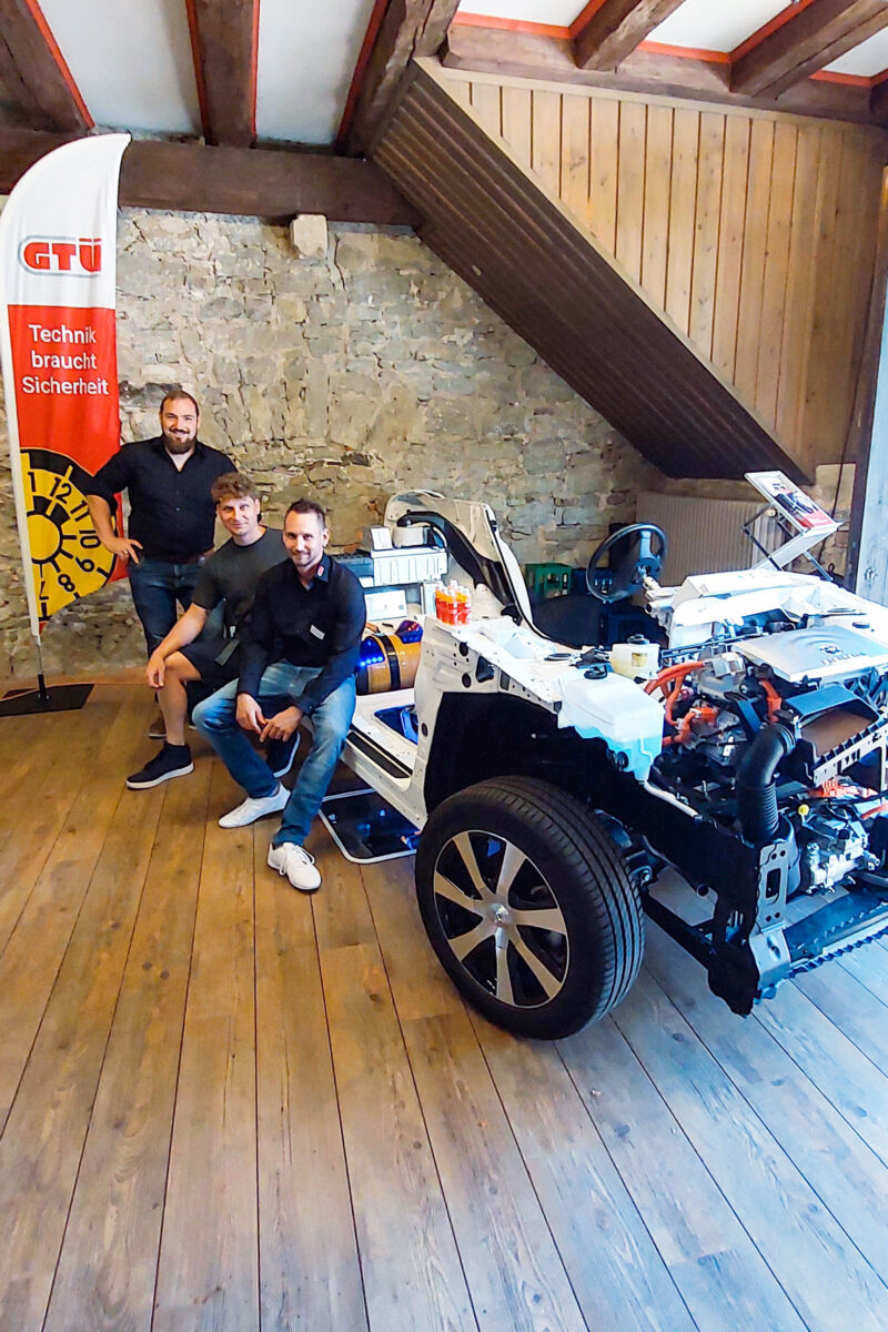 Die modellneutrale Beratung rund um die E-Mobilität wird in der Langenburger Prüfstelle immer stärker nachgefragt. Die Expertise der Ingenieure, die über 35 Jahre Erfahrung in der Sachverständigentätigkeit verfügen, reicht dabei über die Begutachtung gebrauchter E-Fahrzeuge bis zur Lebenszeit der Batterien. Aber auch beim wichtigen Thema der Lademöglichkeiten im Ländlichen Raum können die Ingenieure weiterhelfen. Über den aufgeschnittenen Toyota kamen Experten und Besucher schnell ins Gespräch zu Themen der nachhaltigen Mobilität. Auch Hermann Schenk, Gebietsbeauftragter Württemberg der GTÜ, konnte vor Ort weiterhelfen. Die japanische Großserienlimousine war die weltweit erste mit Brennstoffzellenantrieb. Das aufwändig erstellte Modell zeigt alle Komponenten des Pioniers und veranschaulicht leicht verständlich die Funktionsweise.