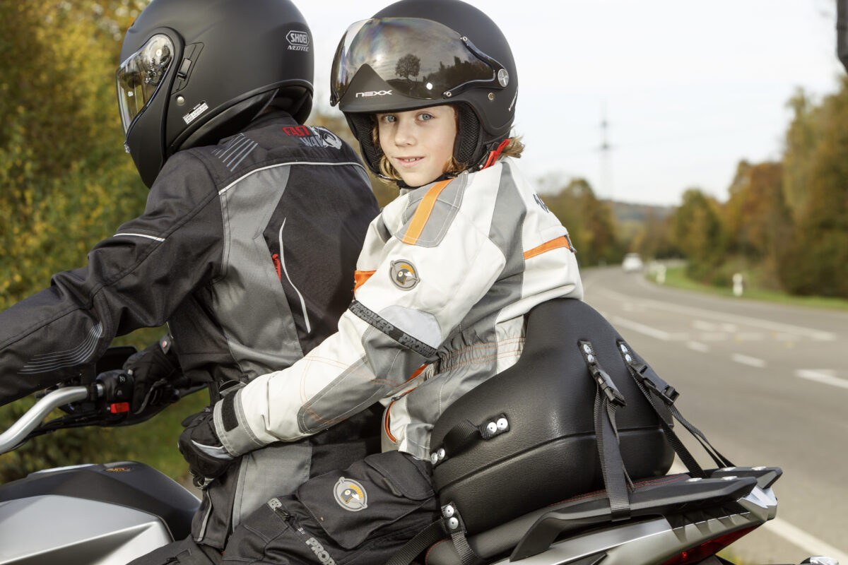 Die Helmpflicht gilt selbstverständlich auch für Kinder. Entscheidend ist, dass der Helm zur Kopfgröße passt und den geltenden Normen entspricht. Darüber hinaus empfiehlt die GTÜ dringend, dass Kinder nur mit kompletter Motorradschutzkleidung fahren: Jacke, Hose, Handschuhe und Schuhe, jeweils mit Protektoren. Erwachsene natürlich auch.